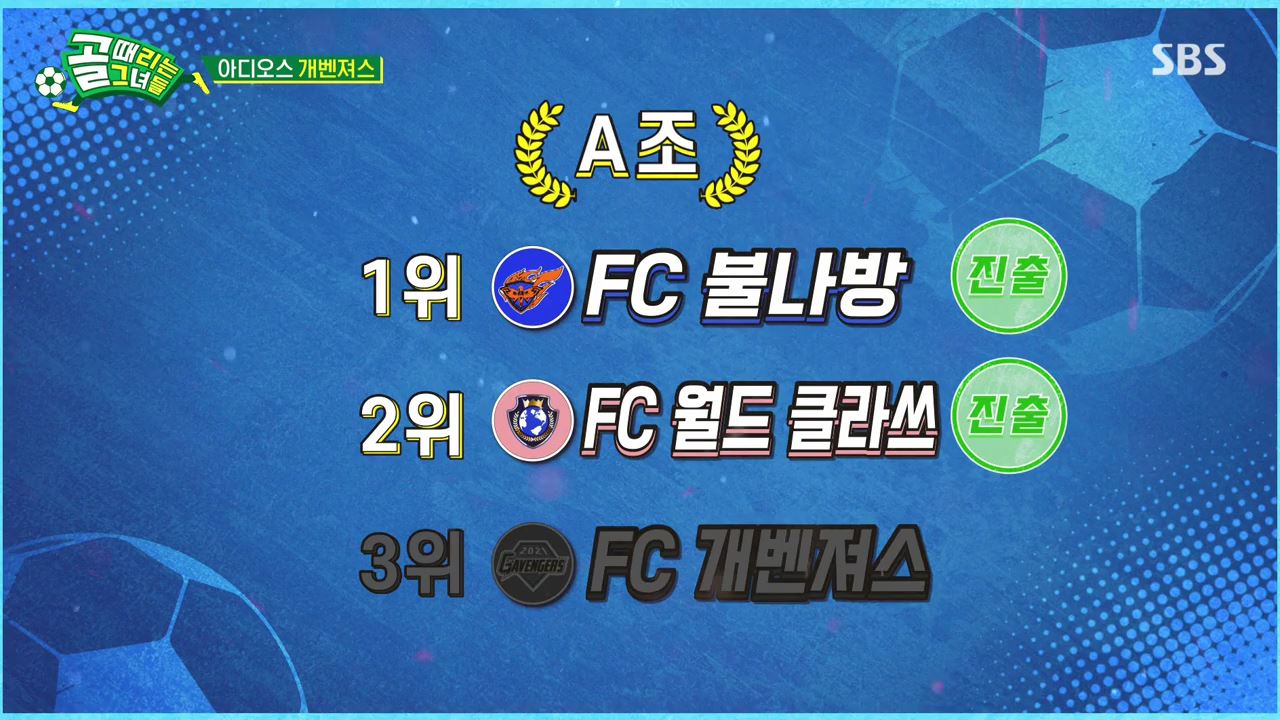 A조의 마지막 시합 (개벤져스 vs 월드 클라쓰)는 두 팀 모두에게 본선 진출이 걸려있는 꼭 이겨야만 하는 경기였습니다. 월클은 무조건 이겨야만 했고, 개벤져스는 비기기만 해도 토너먼트에 진출하는 좀 더 유리한 위치였죠. 이 마지막 경기에서 월드 클라쓰가 1:0로 이기면서 두 팀의 골득실 다득점이 모두 같게 되면서 승자 승 원칙으로 이 경기에서 이긴 월드 클라쓰가 토너먼트에 진출하게 되었습니다.