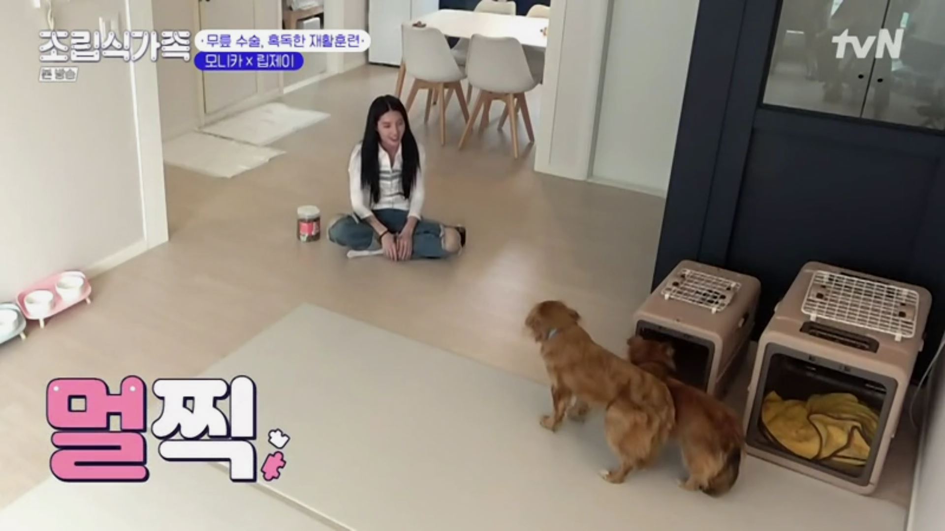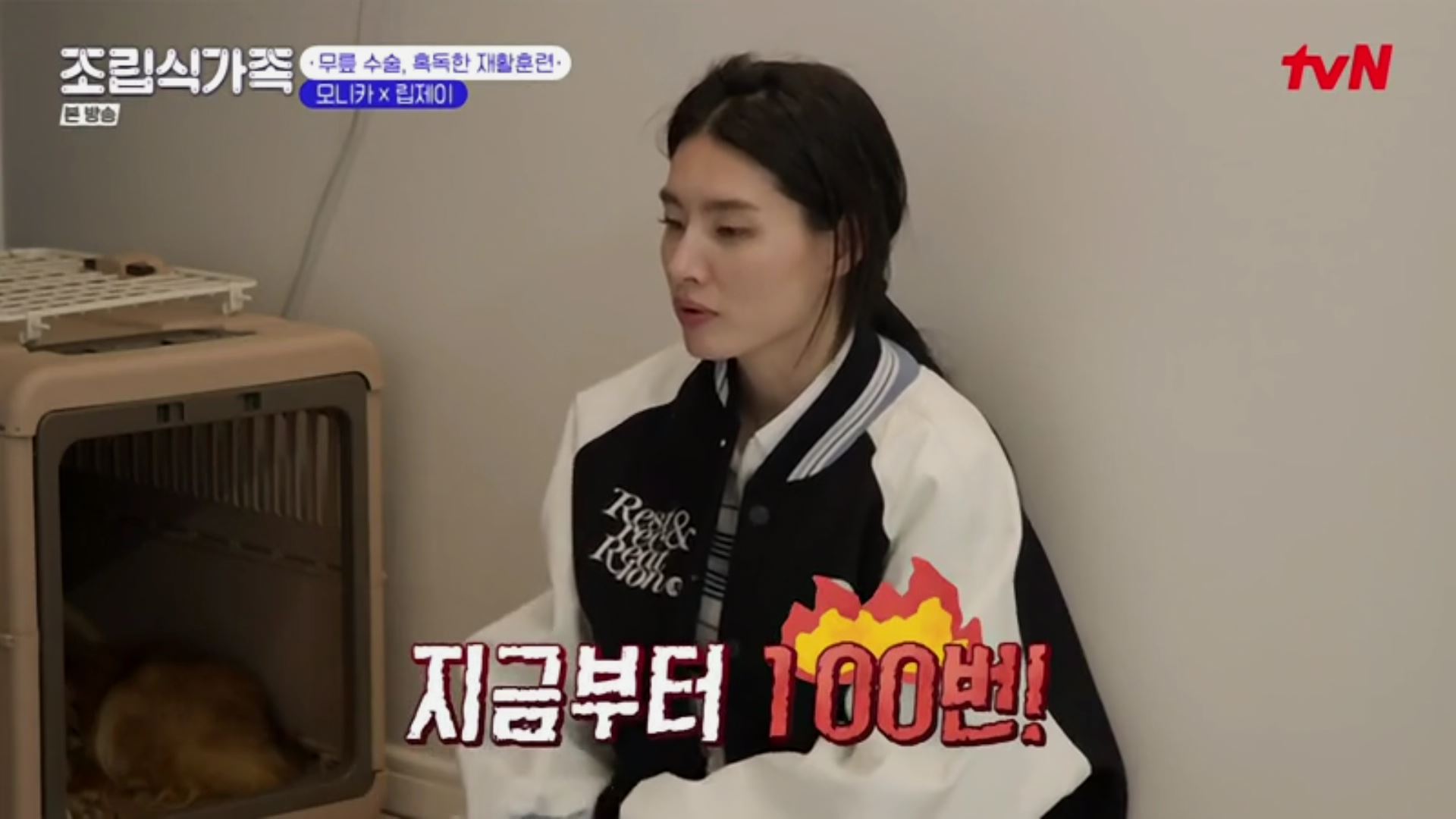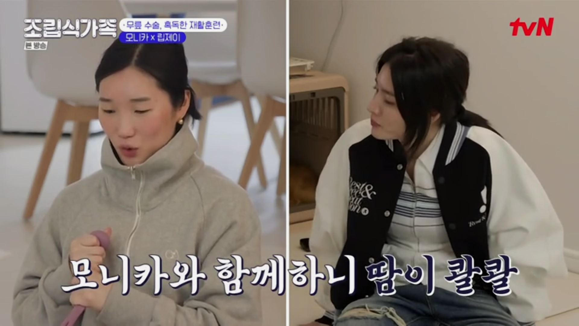 지난 화에서 무릎 수술 후 퇴원을 한 립제이. 집에서 할 수 있는 재활훈련을 모니카 앞에서 선보입니다.