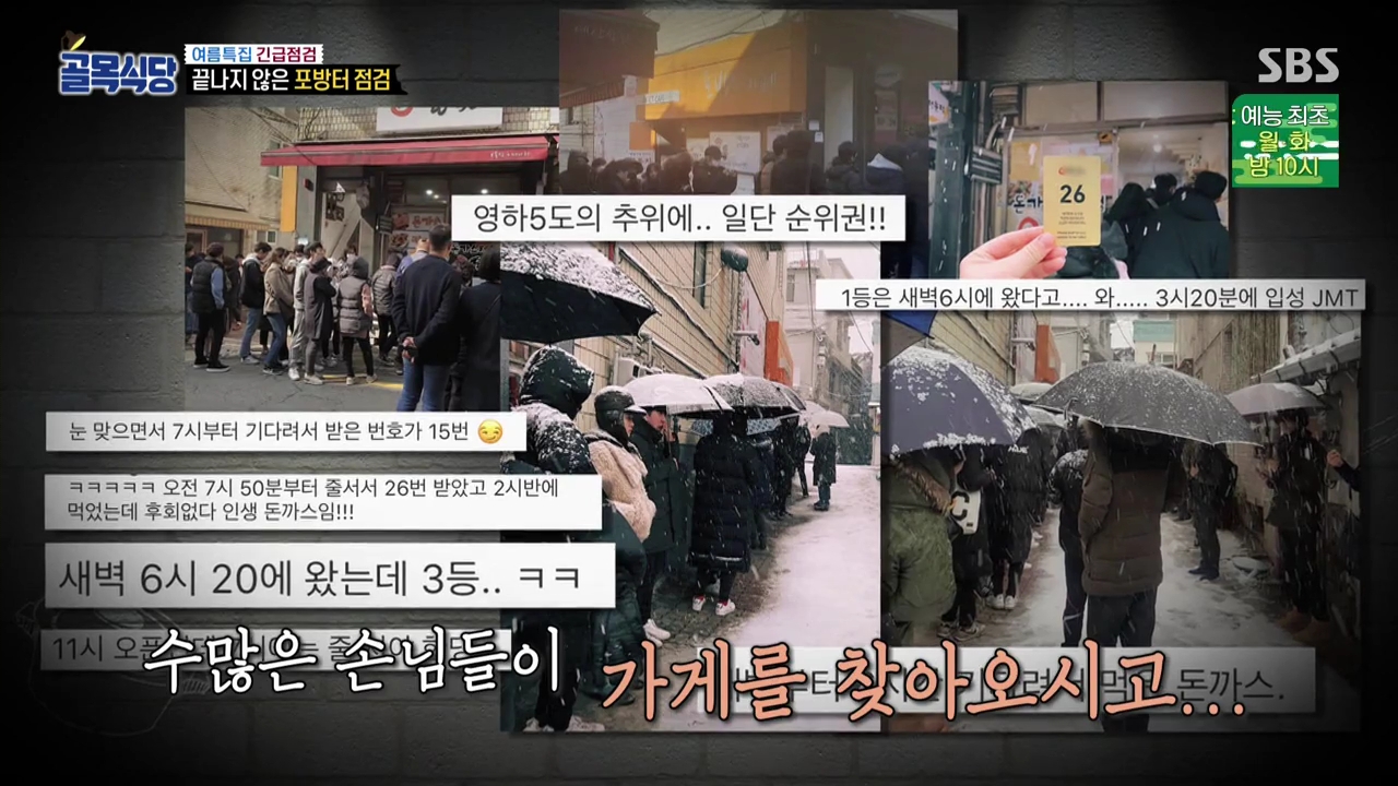 사람들이 너무 몰려 혼잡해지자 주민들에게 항의를 받았고, 그 결과 좀 더 수월하게 손님들을 받기 위해 지금까지 여러 방법들을 시도해본 것으로 알려졌습니다. 처음엔 사비로 손님들이 머물 수 있는 대기실을 빌렸으나 주민들의 민원은 계속되었습니다. 그 후엔 인터넷 예약제도 시도해봤으나 그것은 주변 상인들의 반대로 무산되었습니다. 돈가스집에 찾아온 손님들이 근처 가게들도 들리면서 방송에 안 나온 집들도 덩달아 매출이 올랐는데, 인터넷 예약제를 한다면 아무래도 대기하는 손님들이 줄어들고, 주변 가게의 매출도 줄어들 테니까요. 골목 시장의 활성화를 위해 결국 돈가스집은 불편한 현장 대기제를 선택한 것입니다.인터넷 예약제를 하면 손님들은 물론 돈가스집 사장님들에게도 더 편할 텐데 왜 하지 않는 것인지 의문이었는데 이런 이유가 있었습니다.