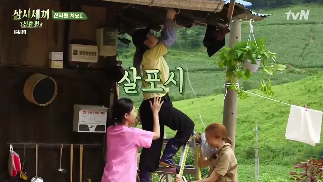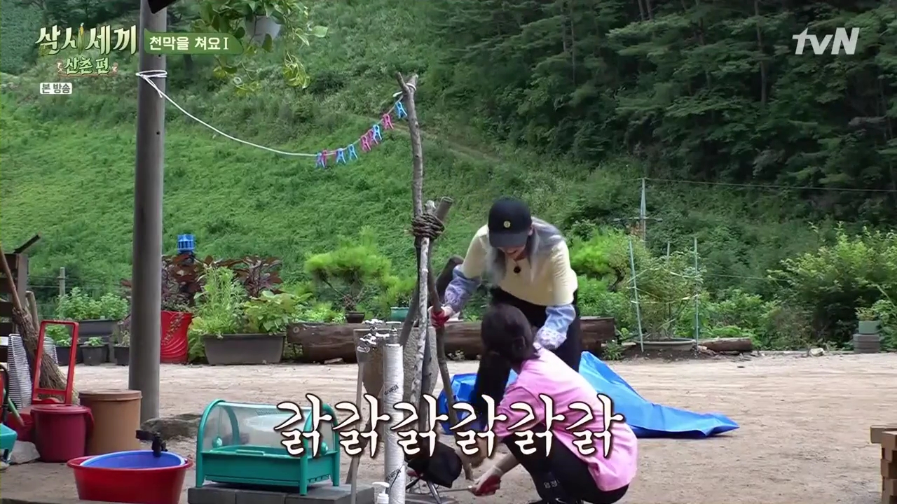 삼시세끼 멤버들은 비올때를 대비해서 수돗가와 아궁이를 커버할 수 있는 천막을 치기로 합니다.