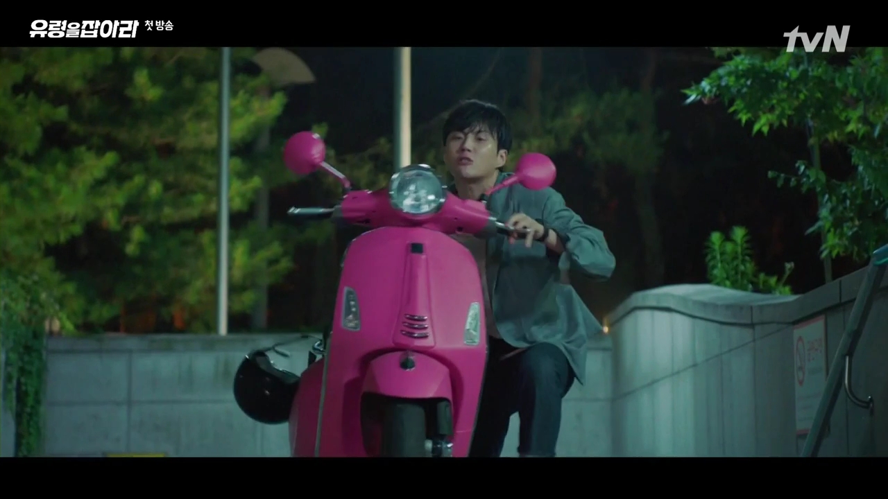 차 유리창에 팔이 끼인 상태로 안간힘을 쓰는 유령을 본 지석은 순간 각성하여 평소와는 다른 터프한 모습으로 스쿠터를 타고 그대로 차 위로 돌진합니다.