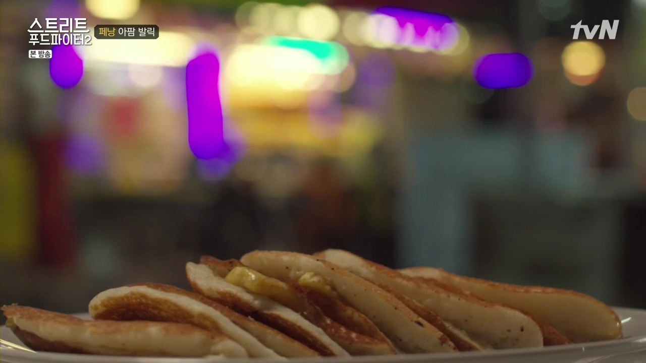 야시장에서 먹은 두 번째 메뉴, 아팜 발릭. 코코넛 향이 느껴지는 팬케이크입니다. 백종원은 바나나를 넣은 아팜 발릭을 골랐습니다.