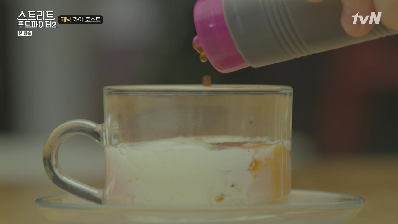 컵에 담겨 나오는 반숙란에는 후추와 간장을 더한 뒤 섞어주고, 거기에 빵을 찍어 먹습니다.