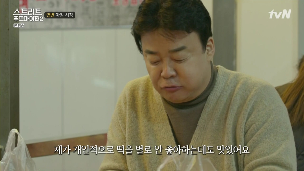 아침 시장에 들른 백종원. 우리나라 시골 재래시장에 온 느낌입니다. 떡을 주문하자 그 자리에서 바로 쳐줍니다.